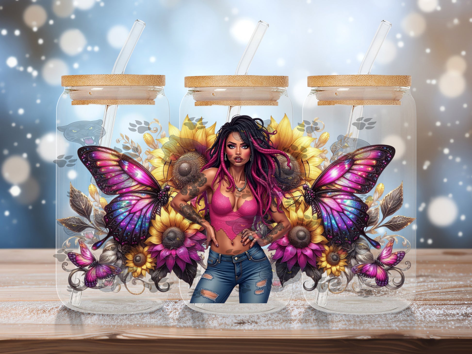 Sunflowers and Butterflies. UV DTF for 16 oz glass can. Ready to press.